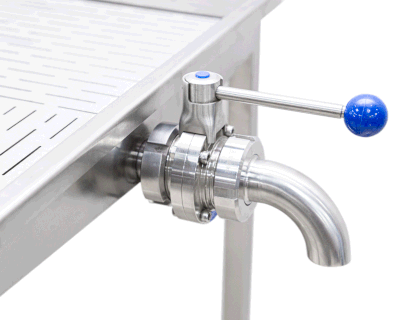 Представляет собой стол из нержавеющей стали с невысокими бортами и загнутыми краями, предназначен для размещения перфорированных форм в количестве от 16 до 20 штук, в зависимости от объема. В сторону сброса излишней сыворотки имеется небольшой уклон поддона. Ниже установлено соединение с краном, к которому подключается отводной шланг. Поддон установлен на каркасе, сделанном из труб квадратного профиля. Для удобства перемещения, под ее углами закреплены поворотные колеса.